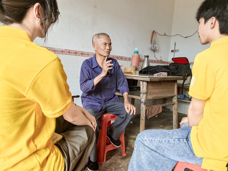 抵达汪老家中时,这位年近九旬的老兵虽已满头银发,但老人目光矍铄,谈及当年的战斗经历,记忆依旧清晰。汪老缓缓讲述着那段峥嵘岁月,从初入战场的紧张忐忑,到面对敌人空袭时的沉着应战,再到与战友们在战壕中相互扶持的深厚情谊,每一个细节都饱含着对国家的忠诚与对和平的珍视。如今,汪老过着平静的乡村生活,但那段战火纷飞的岁月依然深深烙印在他的记忆中。他感慨地说,现在的年轻人生活在和平年代,更应该珍惜来之不易的幸福生活。在交流中,实践队的队员们围坐在老人身边,屏息凝神地聆听着每一段故事。有人悄悄红了眼眶,有人低头沉思,眼中满是敬佩与感动。汪老的故事不仅是对历史的回顾,更是一场心灵的洗礼。队员们深刻体会到,正是无数像汪老这样的革命先辈,用“舍小家为大家”的牺牲精神,才换来了今天的山河无恙、家国安宁。