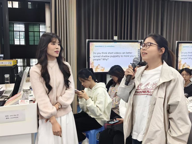 紧接着,皮影戏《孙悟空三打白骨精》片段登场。主讲人提问:“短视频能更好向年轻人传播皮影戏吗?”同学们各抒己见,在观点碰撞中明白传统与现代并非对立,而是可相互助力。