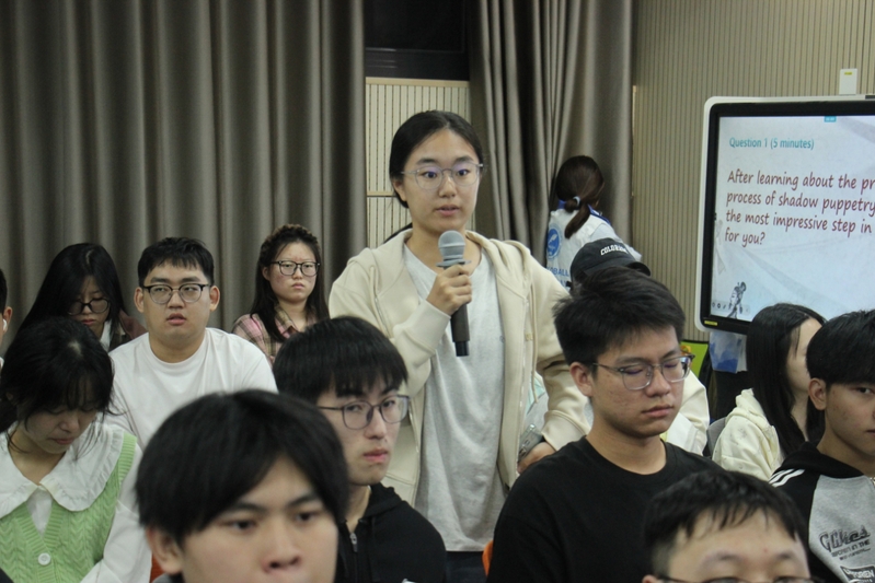 活动伊始,大屏幕播放皮影戏制作影像:选皮制皮精益求精、绘图雕刻分毫用心、着色装订层层考究,每步都凝聚老匠人心血。主讲人引导分享视频感受,同学们纷纷举手发言,在热烈讨论中读懂制作复杂,更触摸到传统技艺背后的坚守。