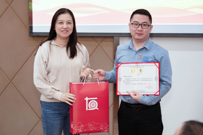 自由交流环节中,同学们踊跃提问,与黄标校友就行业动态、职业路径等话题展开深入探讨,现场气氛活跃,互动频繁。为感谢黄标校友的精彩分享与大力支持,学院特别举行了纪念品与特聘证书颁发仪式,由邵艳群老师、陈小欢老师代表学院为其颁发纪念品与特聘证书。