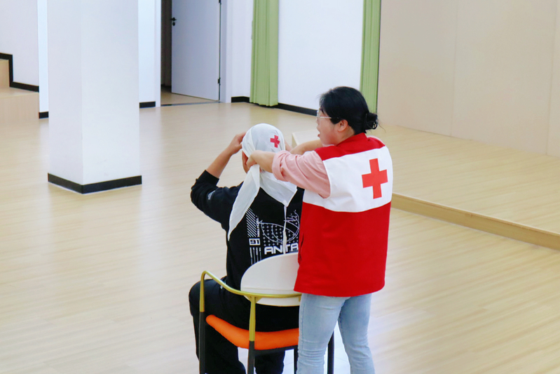 在创伤包扎学习环节,讲师重点演示了针对头部、肘部等不同部位的三角巾与绷带包扎方法,并辅助新学员开展练习。
