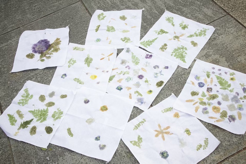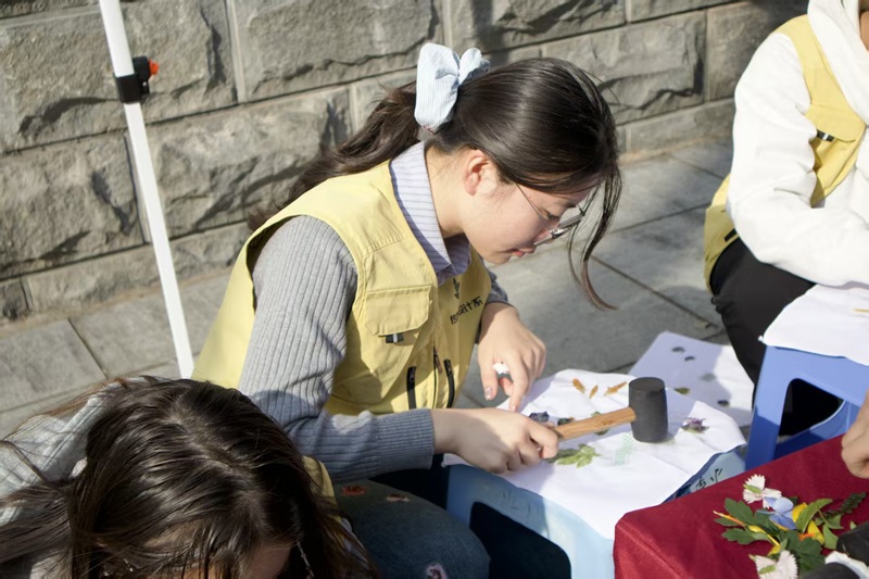 活动现场,志愿者们以热情专注的姿态与参与同学积极互动,用清晰流畅的语言详细讲解植物拓染的步骤与技巧,协助大家挑选心仪的植物叶片与花瓣。不少同学踊跃从校园中寻觅独特绿意作为创作素材,创作过程中,大家围坐一堂,共同探讨植物摆放的创意构图巧思,彼此协作互助、相互鼓励。拓染间隙,现场氛围轻松融洽,同学们积极分享对植物形态的观察体悟,交流自然知识与创作灵感。当一片片平凡的树叶、花瓣在棉布上留下独特印记时,每个人脸上都洋溢着满满的成就感与喜悦之情,同学们纷纷拿出手机,定格这一美好的创作瞬间与合作成果。