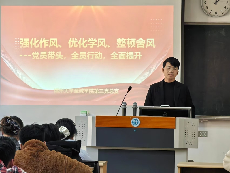 2025年11月21日,福州大学至诚学院第三党总支召开“强化作风、优化学风、整顿舍风——党员带头,全员行动,全面提升”主题会议。会议由第三党总支书记陈智伟主持,各支部书记、辅导员及全体学生党员参加,共同探讨如何通过党员带头作用推动“三风”建设取得实效。
