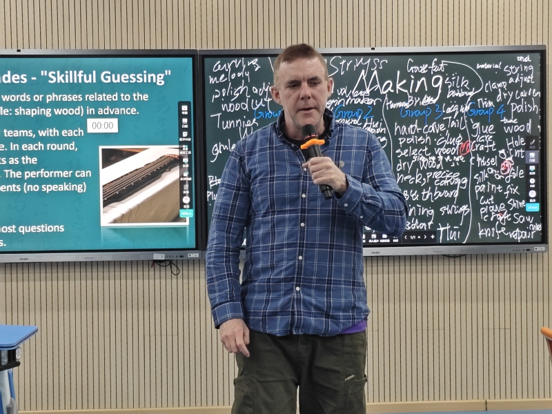 随后的“词汇风暴与故事接龙”游戏中四组同学限时搜罗“wood”“lacquer”等古琴制作相关词汇;故事接龙环节,大家循着“古琴匠人”主线,巧用词汇续写情节,英文表述让古琴制作场景生动呈现。