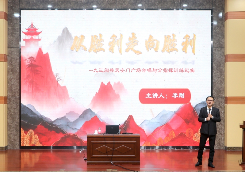 首都师范大学李刚教授紧扣“胜利”主线,以时间轴回顾抗战历程,深入解读抗战精神,同时围绕自身作为九三阅兵天安门广场合唱与分指挥训练总指挥的工作经历,通过生动的训练纪实讲述了“千人同声”背后的故事,将艺术之美与思政教育有效融合。学院参与九三阅兵的陈俊智同学上台分享了他在现场听合唱的感受。