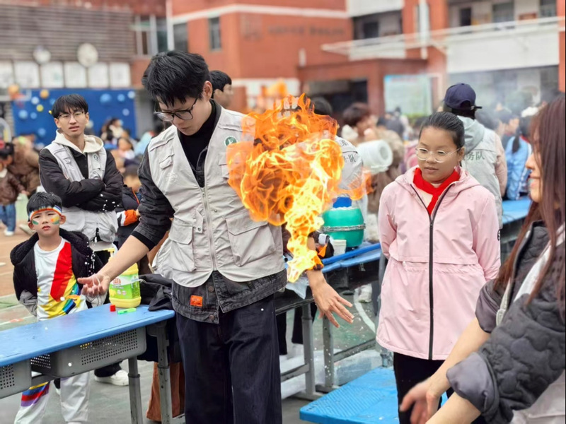 在志愿者们的全程守护下,小朋友可手托可燃气体,由志愿者点燃后瞬间熄灭,感受“手上生火”的视觉震撼!全程无高温、无危险,现场揭秘“水升华吸热”的原理,培养安全防护意识。