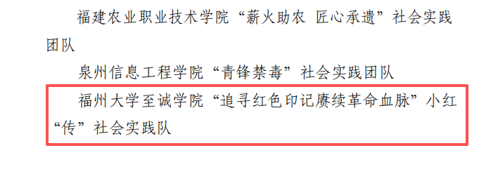 在2025年福建省大学生暑期文化科技卫生“三下乡”社会实践活动中,我院“追寻红色印记 赓续革命血脉”小红“传”社会实践队凭借扎实的实践成效、鲜明的活动特色和良好的社会反响,获评省级优秀实践团队。